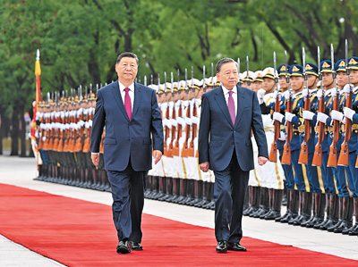 蘇林抵達(dá)時(shí),禮兵列隊(duì)致敬。習(xí)近平同蘇林登上檢閱臺(tái),軍樂團(tuán)奏中越兩國國歌,天安門廣場(chǎng)鳴放21響禮炮。蘇林在習(xí)近平陪同下檢閱中國人民解放軍儀仗隊(duì),并觀看分列式。
